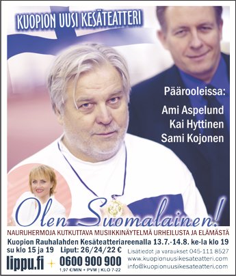 Toinen toimintakesä toi estradille Suomalaisen perheen, kiihkomielisen urheiluvalmentaja Esko Patolan, kihlaparin Akselin ja Elinan sekä runsaslukuisen joukon nuoria avustavia näyttelijöitä ja tanssinopiskelijoita. Ammattilaiskaarti oli vaikuttava – Kai ”Kuju” Hyttinen, Ami Aspelund, Sami Kojonen, Liisa Ruuskanen ja Ville Kiljunen. Nuorten avustavien näyttelijöiden energia ja kokeneiden ammattilaisten kokemus ja karisma loivat kesästä unohtumattoman teatterielämyksen. Olen Suomalainen! –musiikkinäytelmä oli kertomus Voitto Suomalaisesta, perinteisestä suomalaisesta miehestä – tinkimättömine periaatteineen ja peräänantamattomine luonteineen. Vaimonsa Birgitin vastustuksesta huolimatta Voitto lähti juoksemaan 10 000 metrin juoksua Lasse Virenin voitokkaan Munchenin olympialaisten juoksun vuosipäivänä. Urheilusuoritus pyyhki pölyt urheiluhistorian sivuilta, kestävyysjuoksi suomalaista yhteiskuntaa, kolmiloikkasi nostalgisiin sävelmiin ja vaihtoi parisuhteen viestikapulaa. Esitys oli matka suomalaisen sielunmaiseman rikkaaseen maailmaan, joka aukeni muissakin värisäyvissä kuin sinisenä ja valkoisena. Kesän 2011 kruunasi Lasse Virenin suostuminen esityksen viralliseksi suojelijaksi. Lasse ja Päivi olivat kunniavieraina ensi-illassa ja yleisön seisaallaan osoittamat suosiot Lasselle olivat sykähdyttävä ja tunne-elämään syvälle tatuoitu hetki areenantäydelle yleisölle ja lähtölaukaus urheiluhenkiseen teatterikesään. |